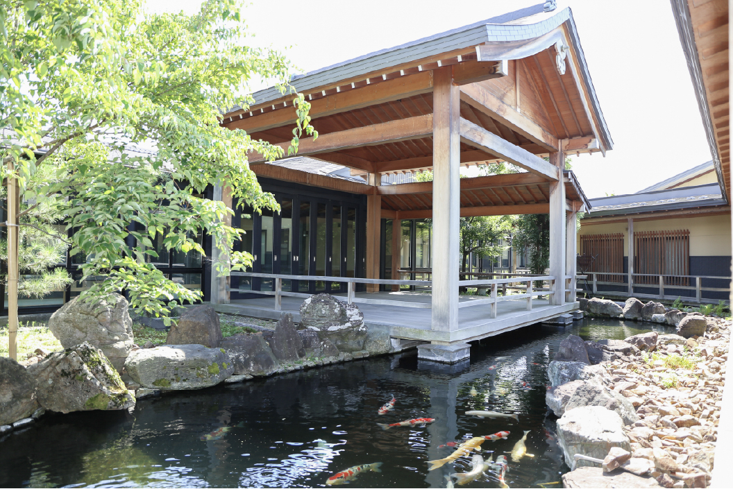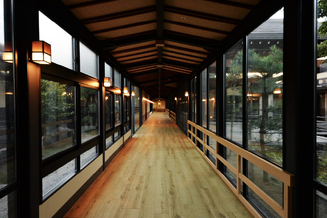 信州中野のお宿、純和風旅館の風情と佇まい、能舞台を囲むように紅梅・琥珀・萌黄・千草・紫苑の五つの棟を配した「フランセーズ悠なかの」。各居室の障子越しに広がる庭木や坪庭が、四季折々の移ろいを静かに映し出します。